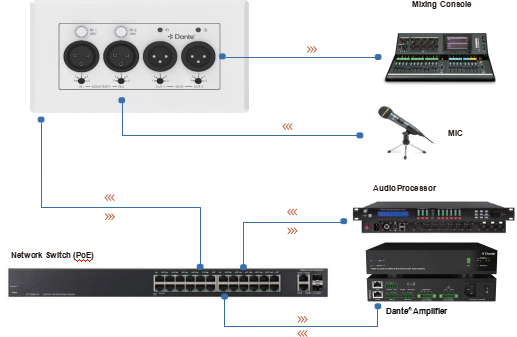100M digitální audio vstup/výstupní port Dante®, připojený k síťovému přepínači prostřednictvím linky RJ45, který podporuje napájení PD.